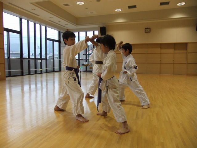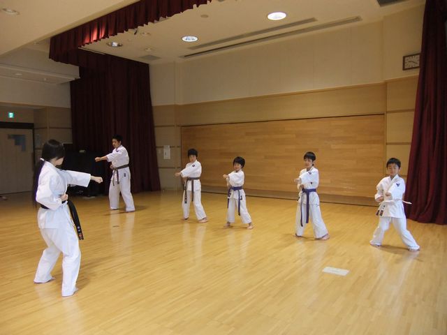 ■稽古内容(90〜120分) 【空手】 稽古は通常、挨拶(礼)→準備体操→柔軟体操→基本稽古→移動基本 →型稽古→組手稽古→整理体操→挨拶(礼)の順で行います。